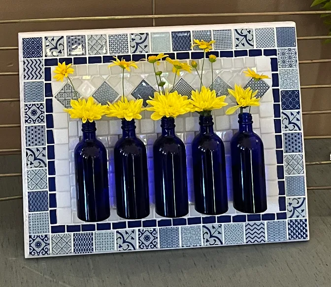 | Materials | Blue Glass Bottles, Hand-cut glass mosaic tiles, MDF Base |
