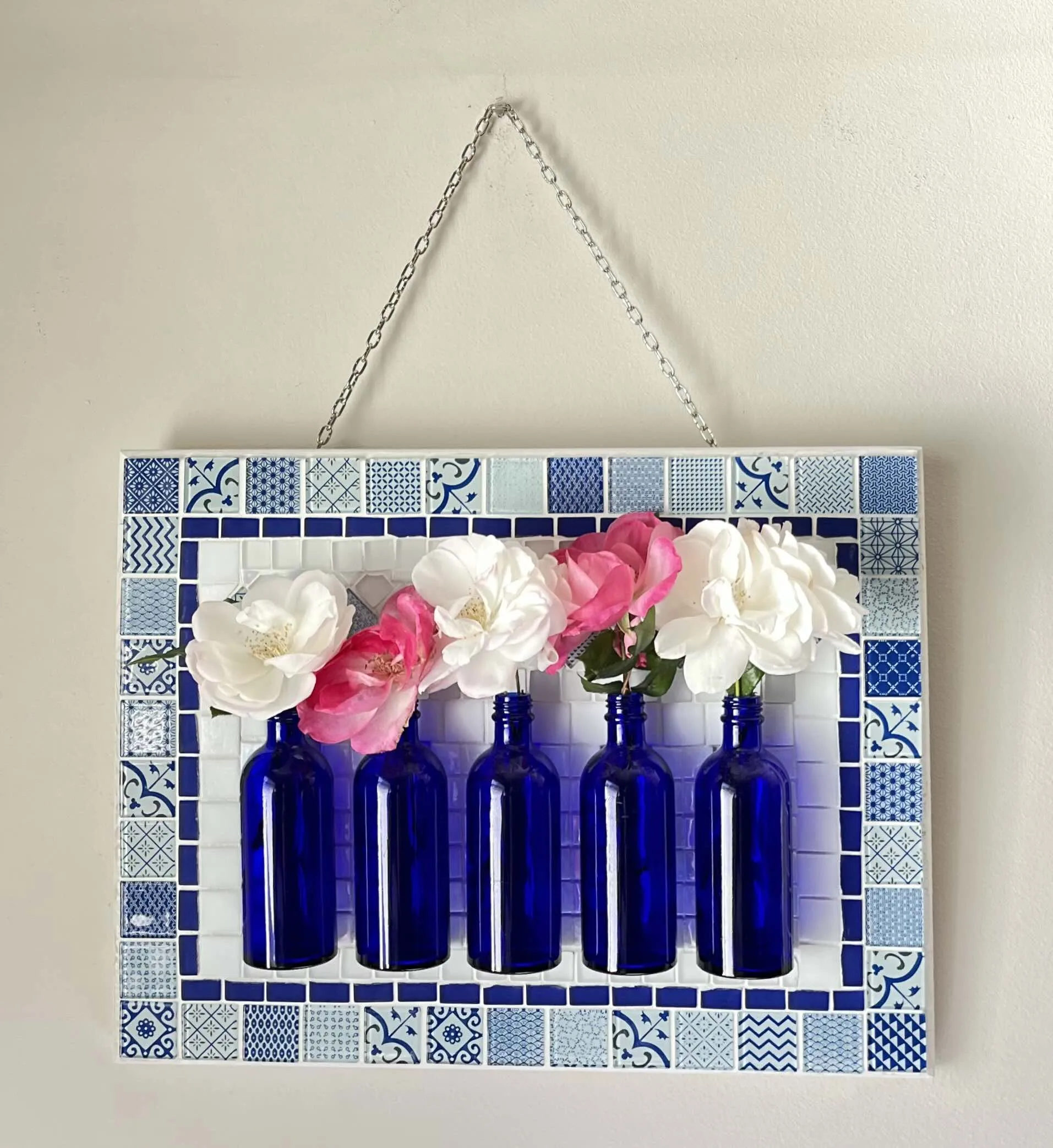 Covered in hand-laid blue and white mosaic tiles, this piece catches the light with subtle reflections. Five beautiful blue glass bottles are secured across the surface, ready to be filled with fresh flowers, dried stems, or even a sprig of greenery from your garden.